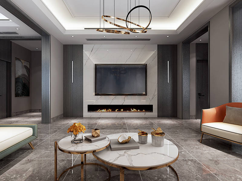 客厅空间在装修时,多以石材进行装饰布局,背景墙流动感的纹理与细腻质感的沙发等形成呼应,彰显优雅惬意的居室氛围。